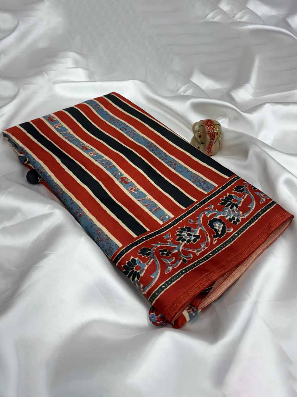 - Material: Satin Crepe Red Grey Strips with Ajrakh pallu